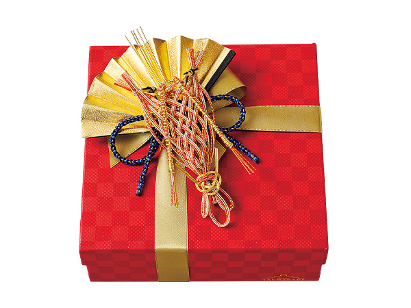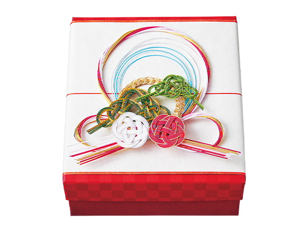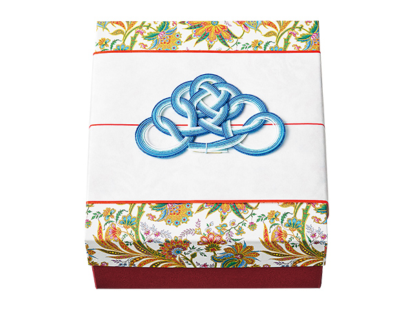 人と人との絆を結ぶ水引細工をあしらって。(B)はオリジナル箱。