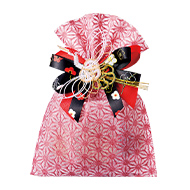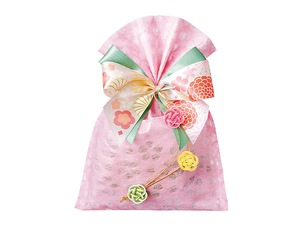 不織布のパックに梅結びの水引飾りのあしらいが素敵。