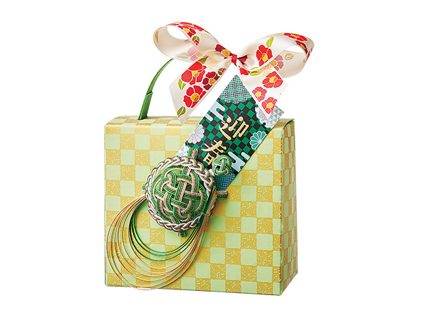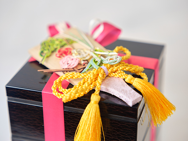 松竹梅の水引をあしらったのし飾りがめでたさを伝えます。