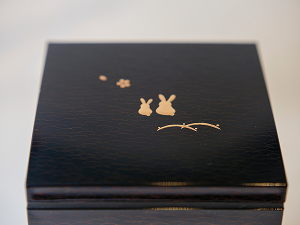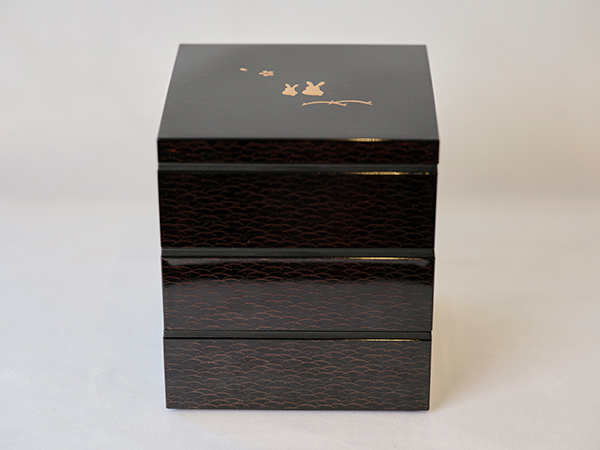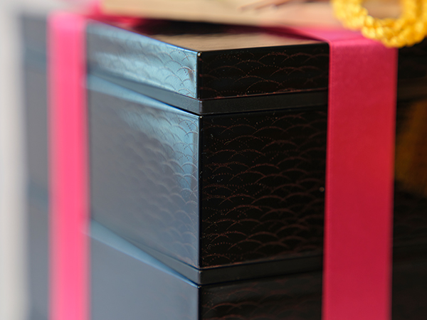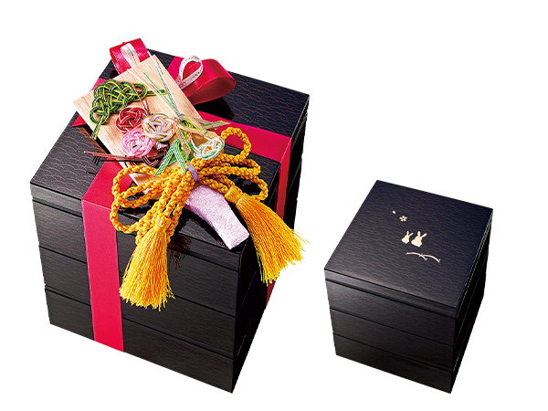 山中塗(合成漆器)の三段重に水引飾りが華やかな羽子板をあしらって。