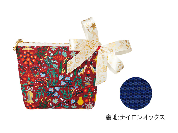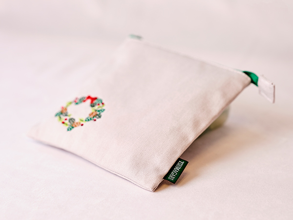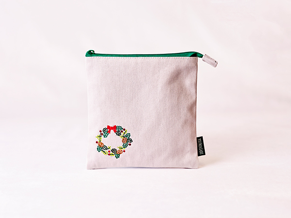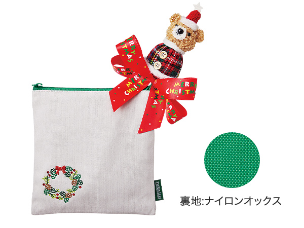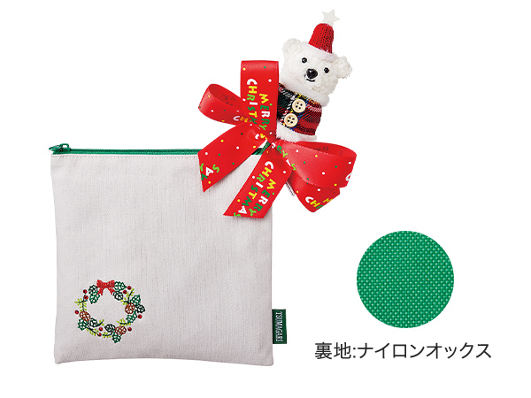 スワロフスキー社のラインストーンをあしらったリースのオリジナル刺繍入りファスナーポーチ。クマのマスコットを添えて。