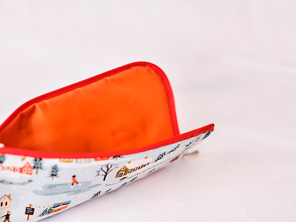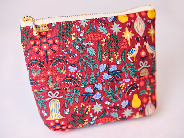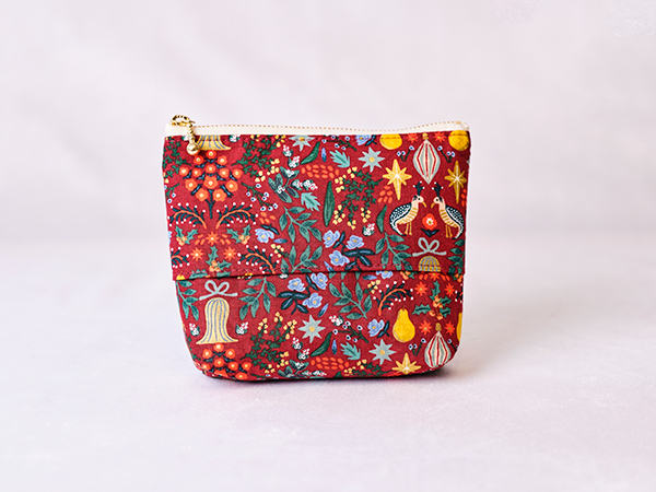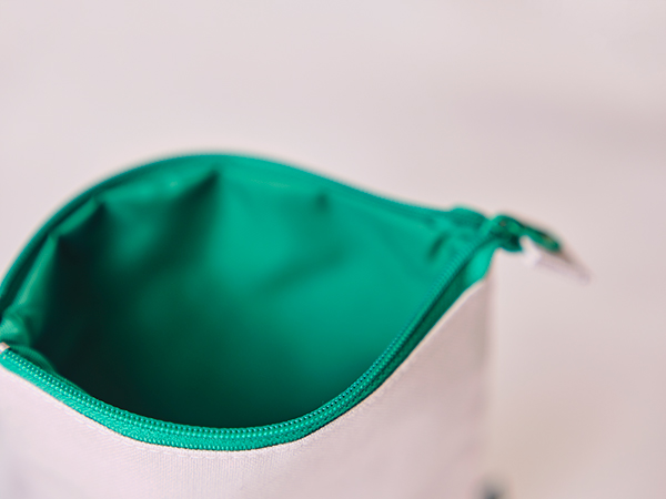 L字型に大きく開いて出し入れがしやすいファスナーポーチ。