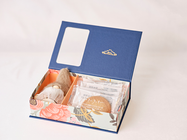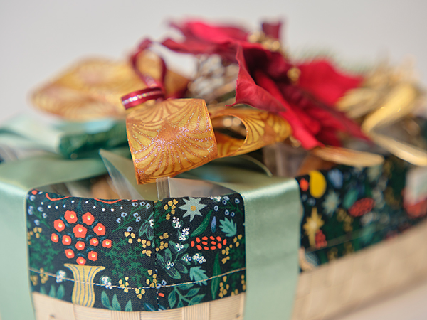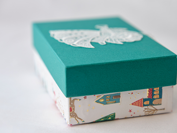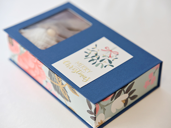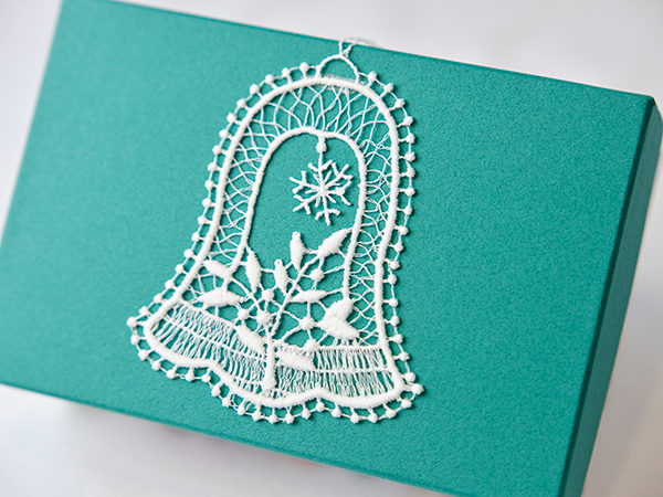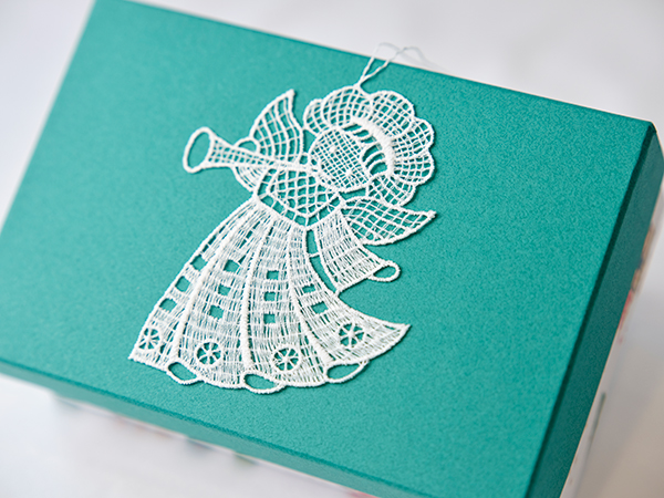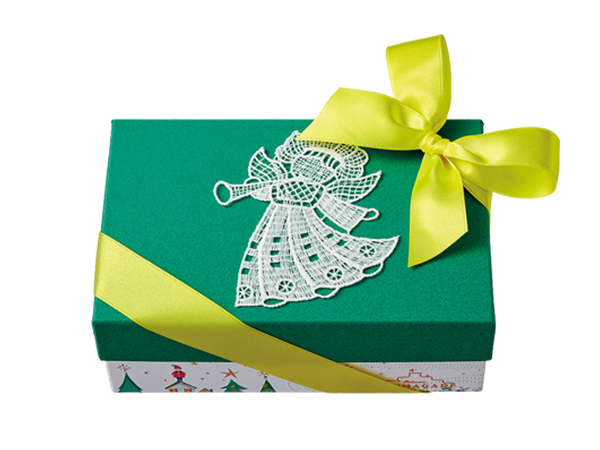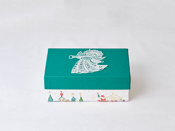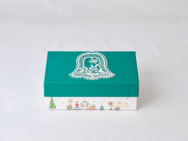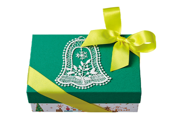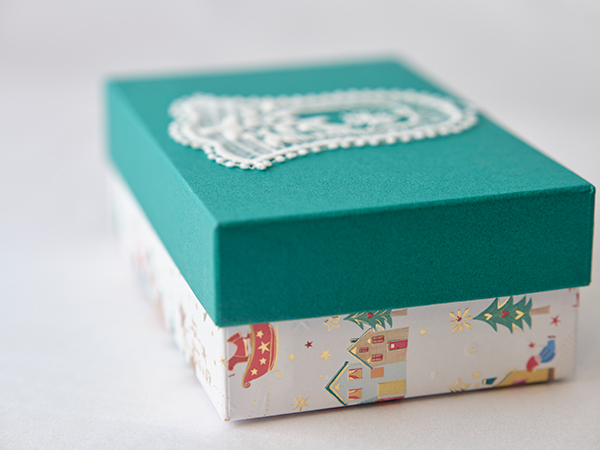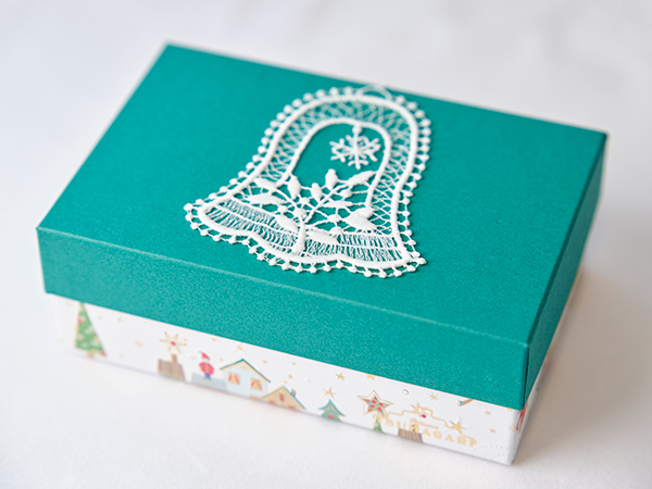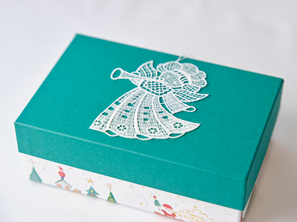 ドイツ製のレース飾りが鮮やかに映える贈り物。貼り箱はTURNOWSKY社のペーパー使用。
