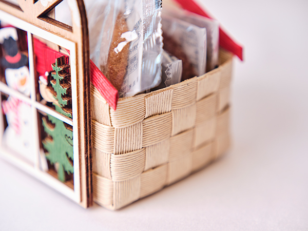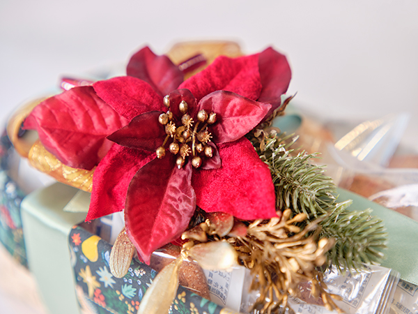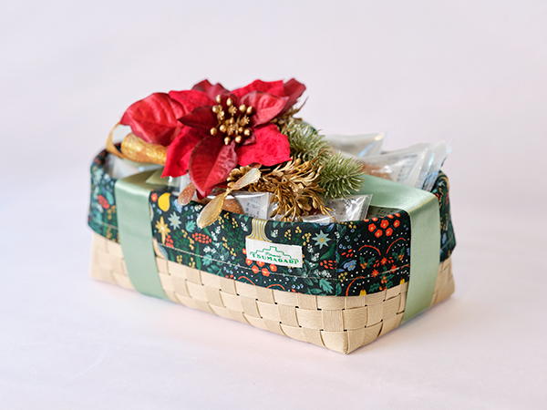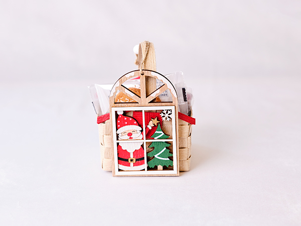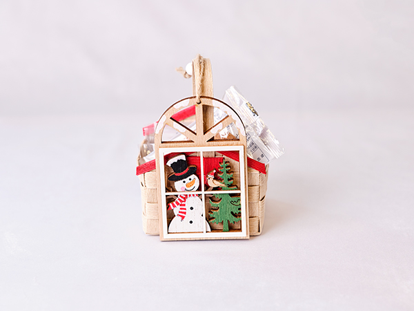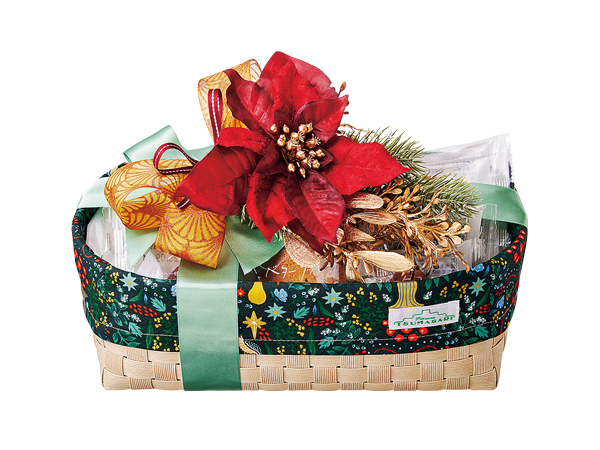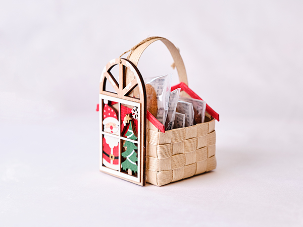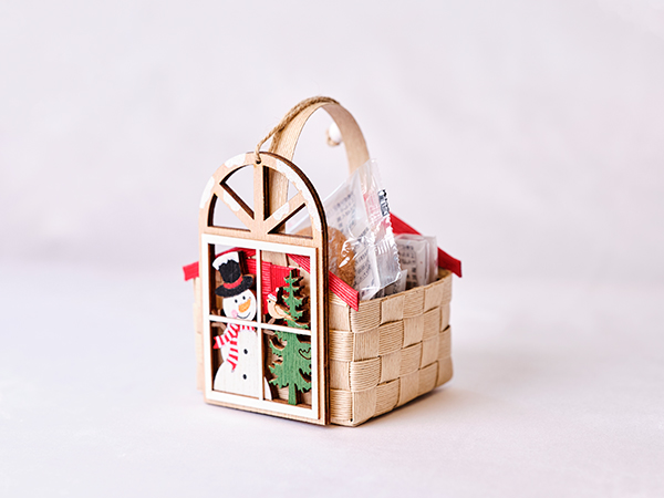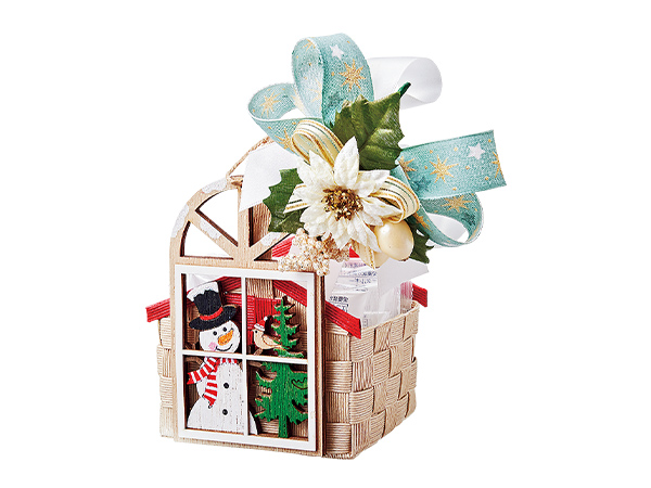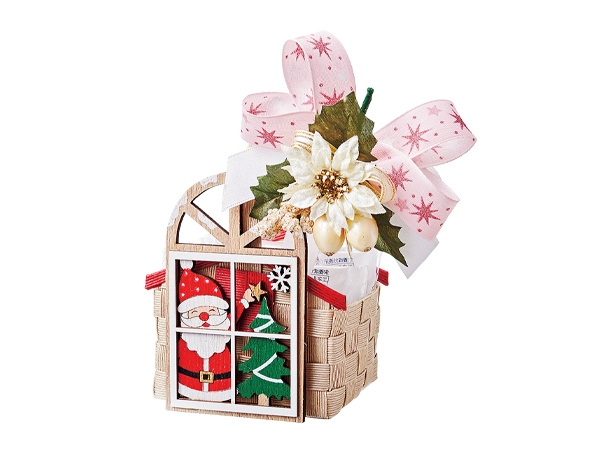 国内で手作業でつくられたペーパー素材のカゴに、木製オーナメントとポインセチア飾りをあしらいました。