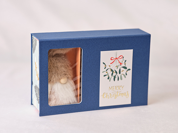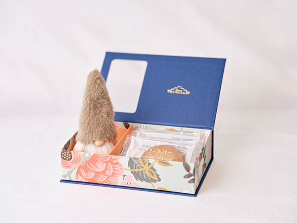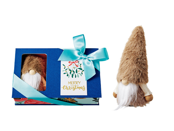 サンタクロースの助手トムテのマスコットを添えて。箱はフロリダ・ライフルペーパーコーのペーパーを使用。